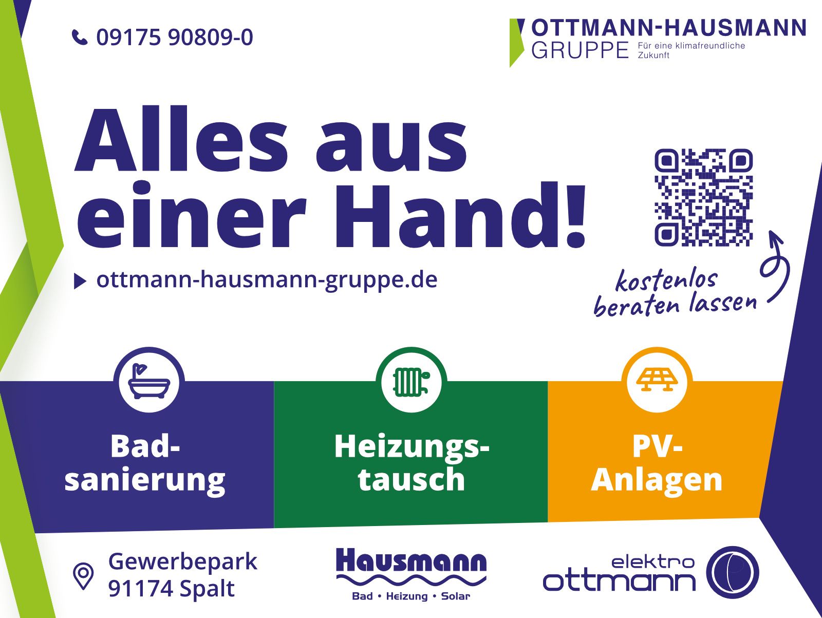 Bei der Ottmann-Hausmann Gruppe stehen wir für eine klimafreundliche Zukunft. Als Zusammenschluss der Unternehmen Elektro Ottmann, Hausmann Haustechnik, Ortner und RG Anlagenbau verfolgen wir das gemeinsame Ziel, nachhaltige Lösungen für unsere Kunden und die Umwelt zu schaffen.